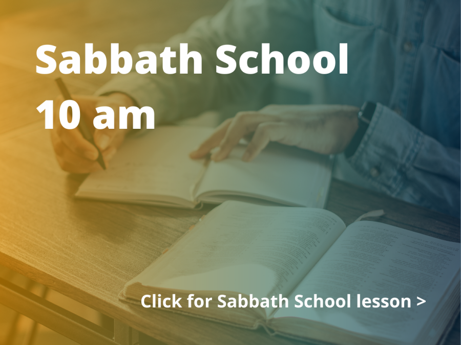 Before worship, join us for Sabbath School from 10 a.m. - 10:45 a.m. This is a time to join the church body in Bible study and ask questions. See our current Sabbath School Guide online. NOTE: there are multiple Sabbath School classes running concurrently each Sabbath:
